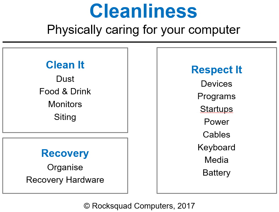 In summary, be aware that your skin has natural oils meant to keep your skin functional and that includes fingers. Fingers leave prints, traces of biological oils get left on screens, keys, mice etc. so try to keep input devices clean i.e. don't use a keyboard or mouse if your fingers are sticky. Bear in mind that keyboards have moving parts and moving parts don't like physical stress such as fingers hitting them hard so don't smash the keys of your keyboard. DVD and Blu-ray drives also have moving parts and everyone knows that DVD and CD media can be easily scratched so treat them with respect and always take care when inserting or removing devices and media. Always take care with respect to cables, USB devices and other things attached to or plugged into your PC or laptop. Don’t yank or pull on cables or cords as doing so can damage the cable or, worse still, the socket itself. Ensure that your computer is used in a place where there is good ventilation and air circulation; computers rely on air to cool themselves so think carefully about where you place yours and make sure the vents are not blocked. Finally, as discussed above, food and drink near computers is a pretty bad idea, spilling stuff on computers makes them sticky and messy so keep food and drink away from them.